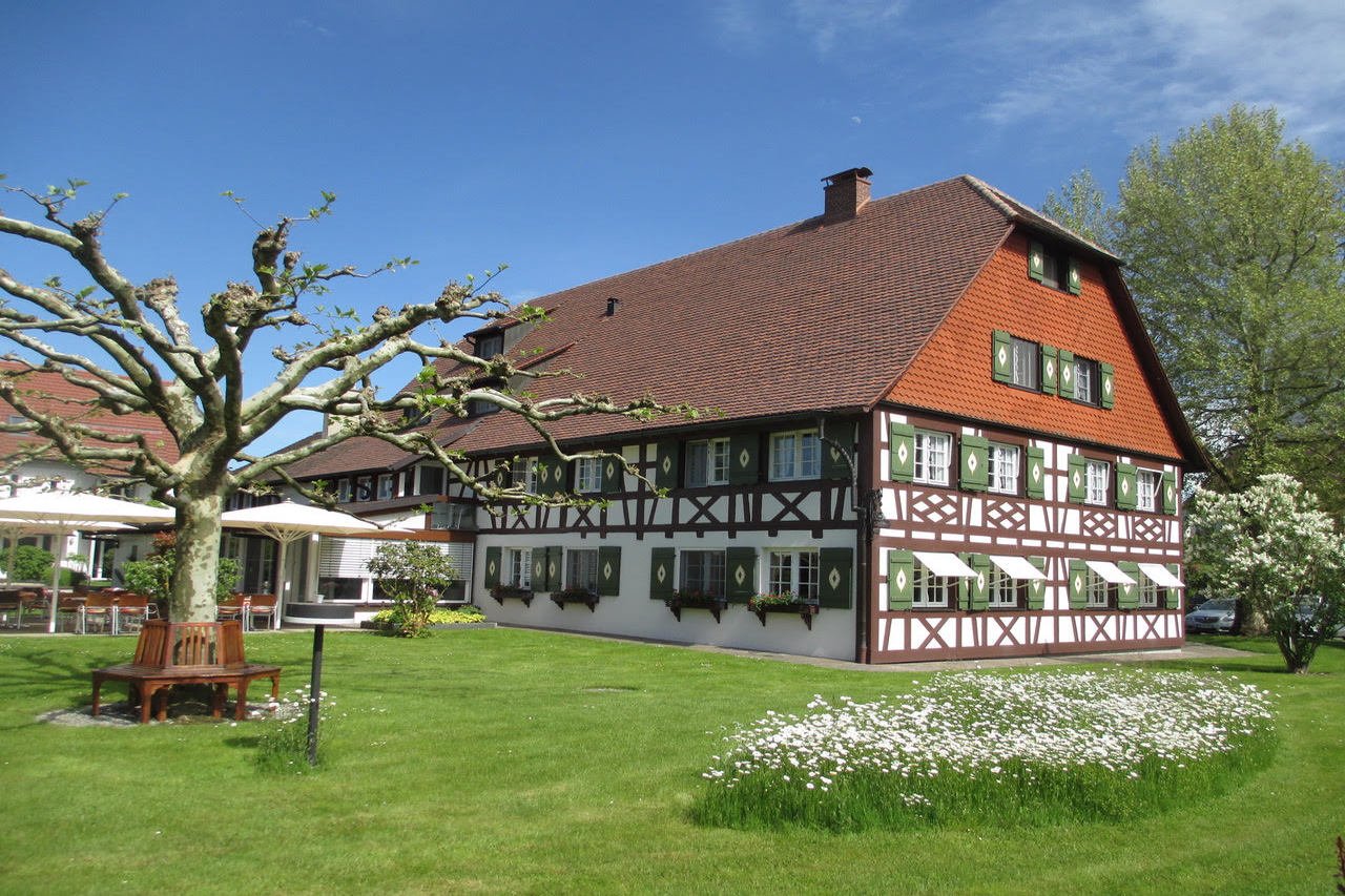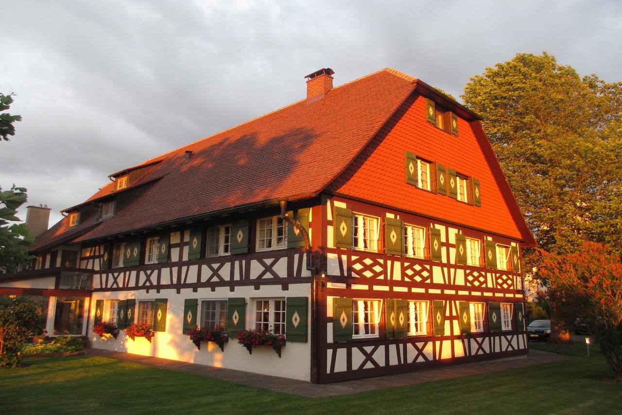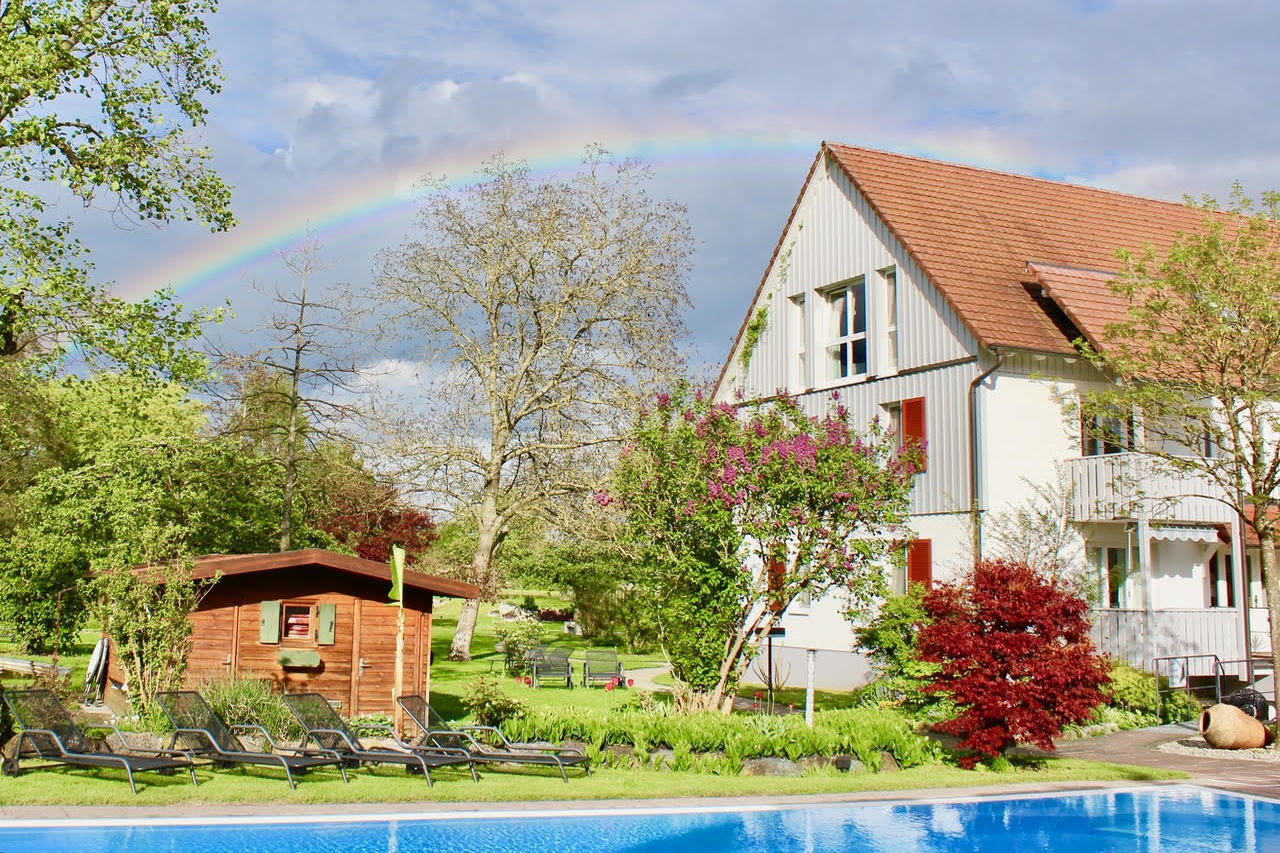Der Wiesengrund ist zum Schwimmbad und Garten hin ausgerichtet. Außer zwei hellen Doppelzimmern sind hier die vier Appartements mit Balkon besonders bei Familien beliebt. Die Wellnessanlage, der Massageraum und die Fitnessgeräte befinden sich in diesem Gebäude.